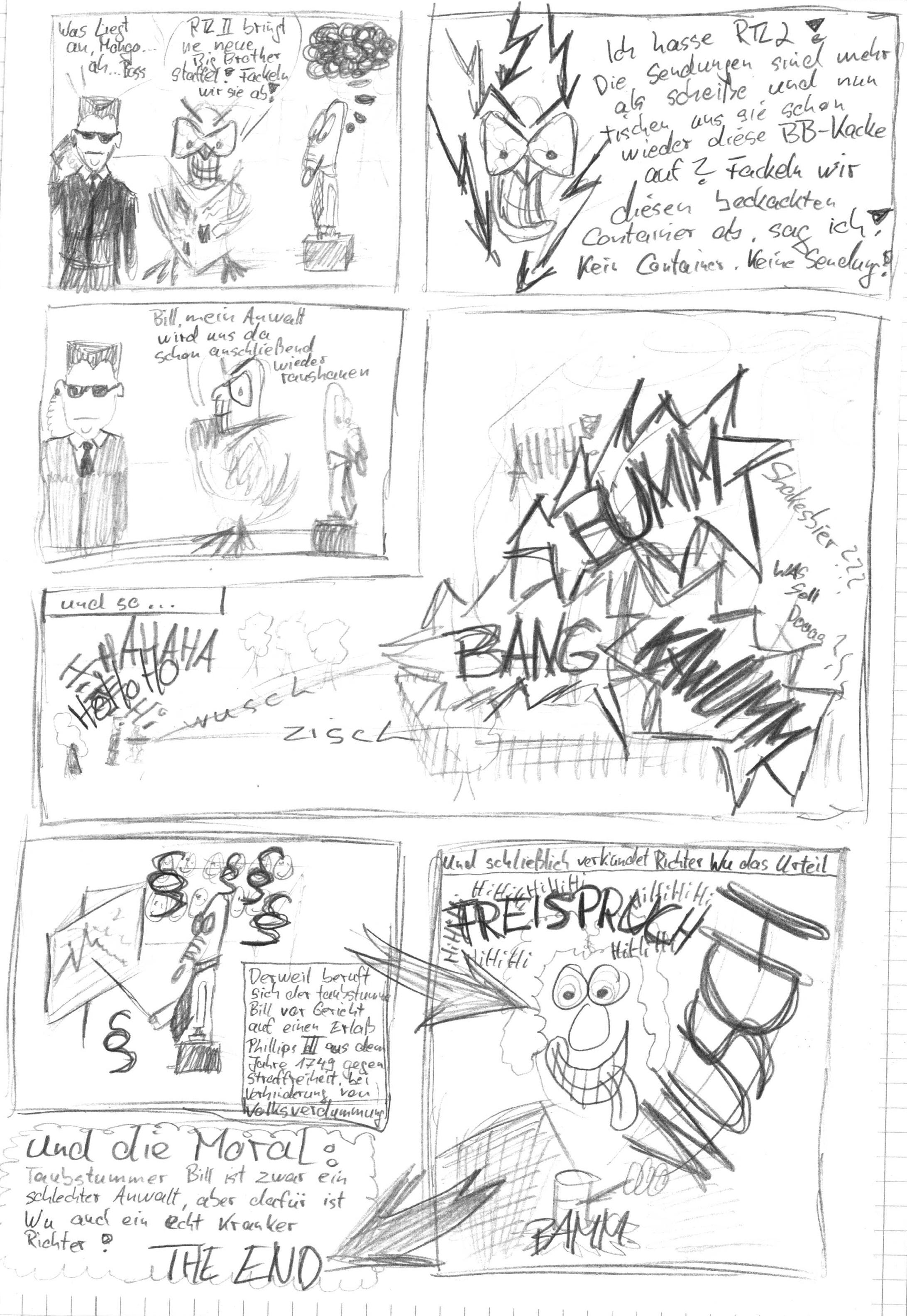 mongos welt (JPG, 791 KB) ist der Titel eines Comicstrips, für den ich die Idee vor ca. drei Jahren hatte. Der Titel ist nicht diskriminierend gemeint, möchte ich anmerken: Ich hatte die historischen Mongolen im Kopf, die vor ettlichen Jahrhunderten wütend durch die Lande zogen. Hauptcharaktere sollten sein: Mongo, ein anarchistisch gesinnter Papagei, der gerne Brände legt; sein Bodyguard; taubstummer Bill, der als Mongos Anwalt agiert; und Richter Wu. Der Kerngedanke des Strips war, dass Mongo Brände legt, für die Bill vorher oder hinterher die rechtliche Grundlage schafft. Ich gebe zu, es ist sehr plump, aber ich war damals noch (sehr) jung und fand es (bzw. finde es immer noch) sehr lustig. Richtige und, wie ich finde, sehr gute Zeichnungen findet ihr hier , in dem Blog von marcofinkenstein.